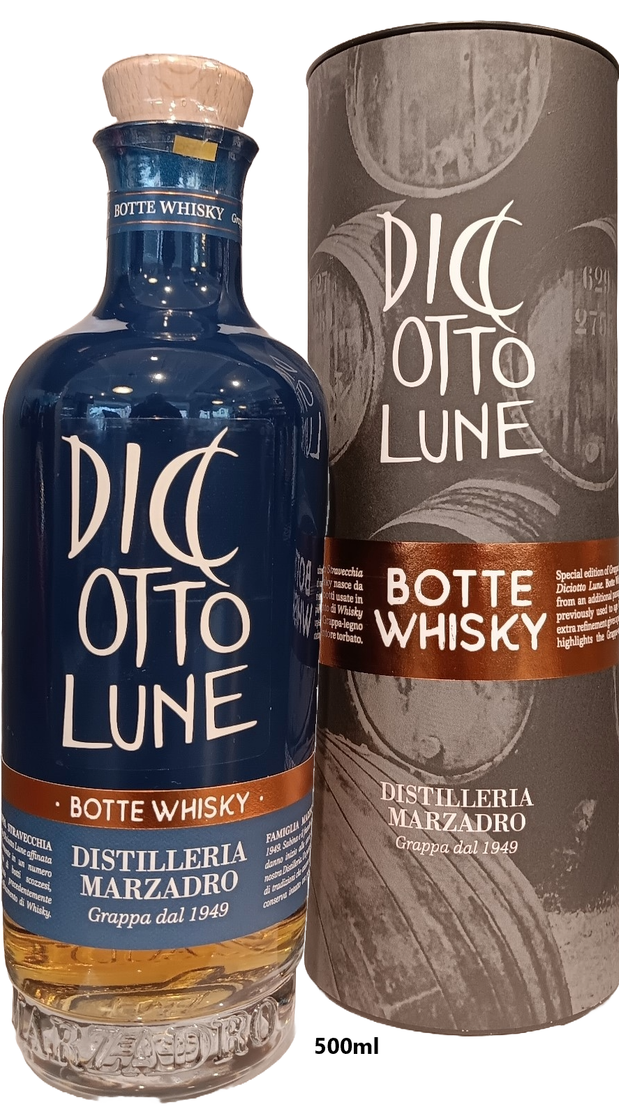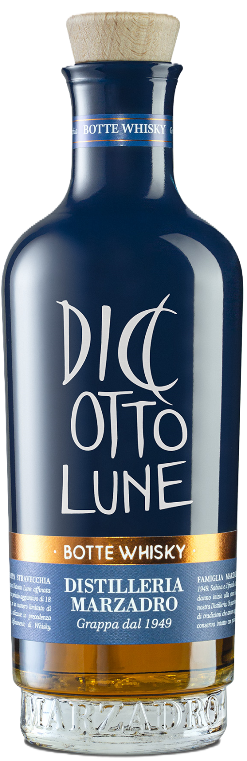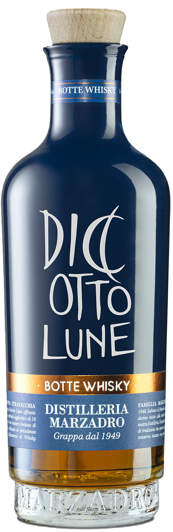 Trestern von einer Mischung aus roten und weißen Rebsorten formen die Basis für diesen Grappa. Er ist 18 ("diciotto") Monate in Holzfässern aus Eiche, Kirsche, Esche und Robinie gelagert. Die zusätzliche Reifung in sorgfältig ausgewählter schottischer Fässer, die zuvor zur Alterung von Whisky verwendet wurden, ergibt einen bestimmteren Grappa-Holz-Kontrast und einen dezenten Duft von Torf und süßlichen Gewürzen.