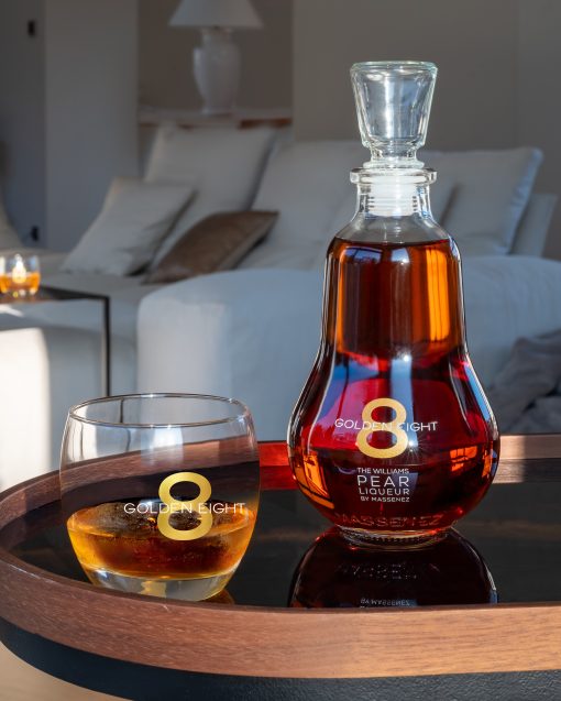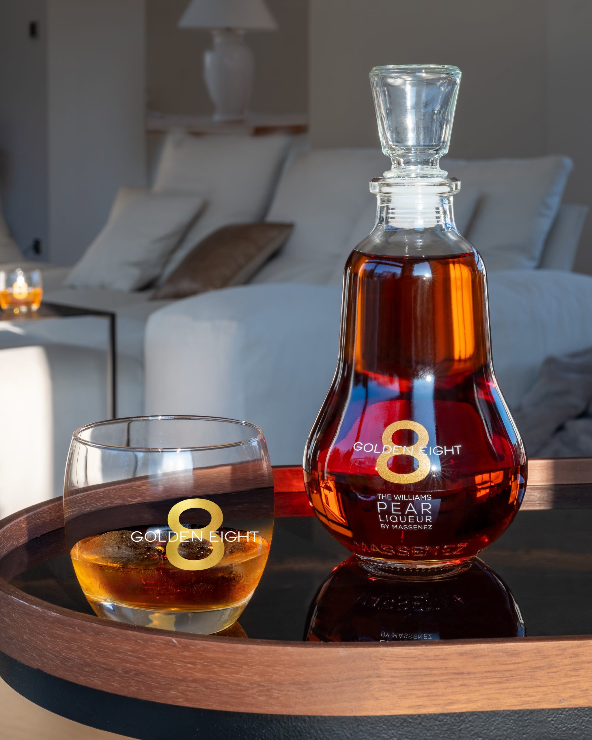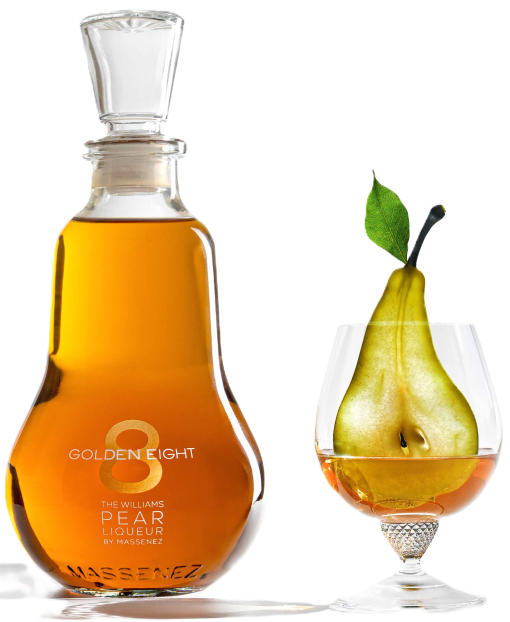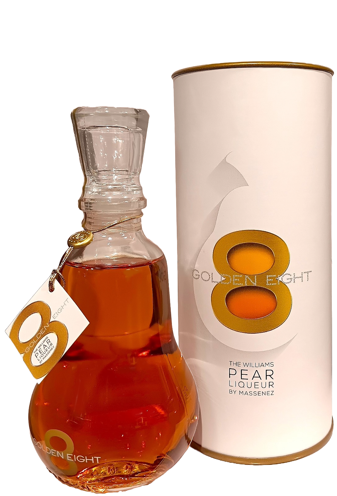 „Eight“ ist das Alter des jüngsten Williamsbirnen Eau-de-Vie, das Teil der Rezeptur ist. "Golden" steht für die wunderschöne Bernsteinfarbe mit goldenen Reflexen im Glas.