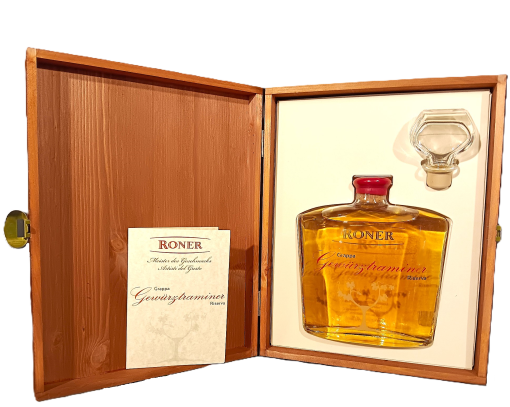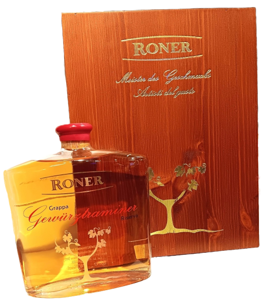 Dieser hochprämierten Grappa punktet mit herrlichen Duftnoten von Frucht- und Röstaromen vom aromatischen Traubenmaterial und von der Reifung im Barriquefass. Die ganze Leidenschaft und das handwerkliche Können der Roner-Brennereien ist in diesem raffinierten Gewürztraminer-Grappa gebündelt. Er eignet sich sowohl als Aperitif als auch als Digestif nach einem feinen Dinner. Perfekt als Geschenk, da er in einer edlen Holzkassette geliefert wird, die auch einen schönen Glasverschluss beinhaltet!
