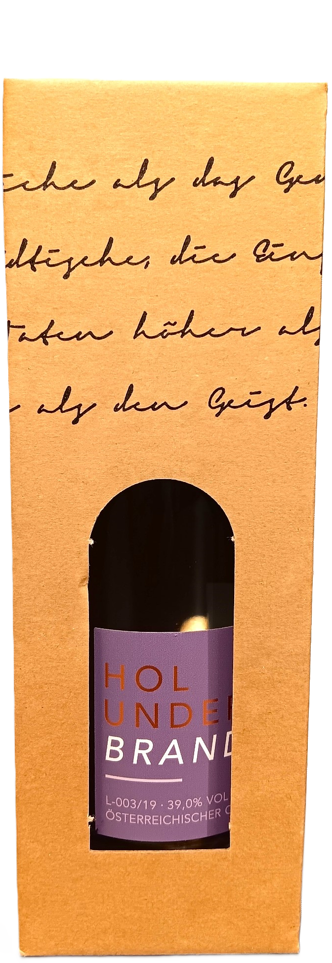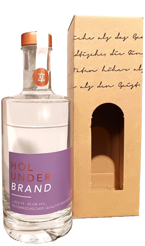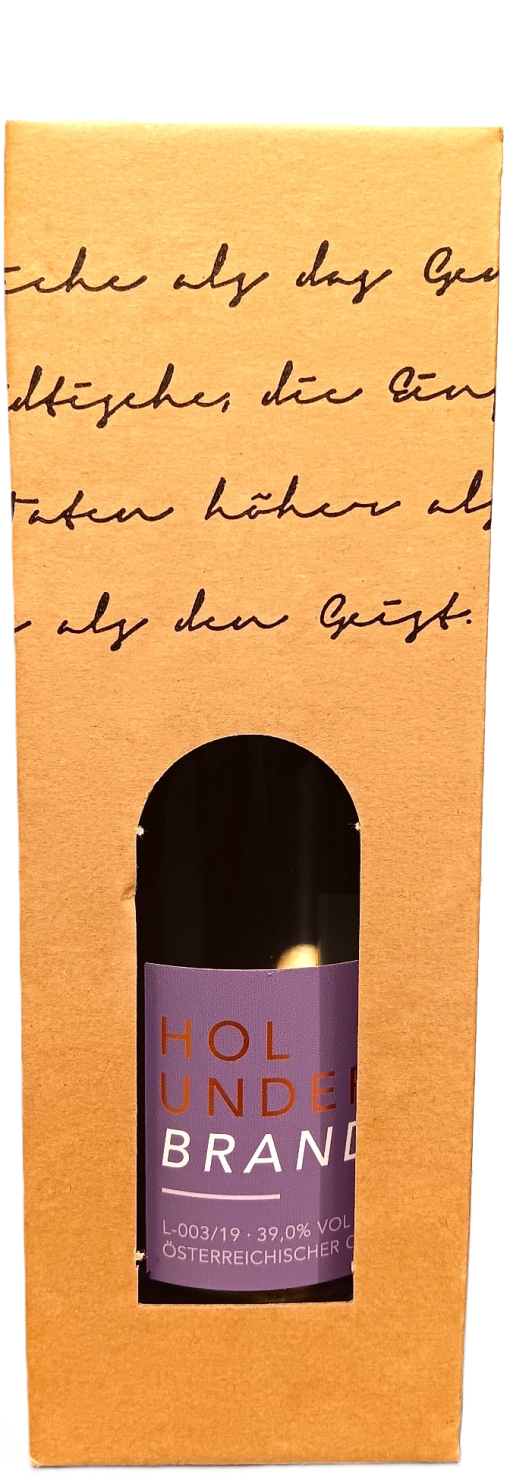 Vollreife schwarze Holunderbeeren werden mit der Hand gepflückt und schonend weiterverarbeitet. Die daraus entstandene Maische wird in einem sehr schonenden Verfahren gebrannt. Danach wird dieser Raubrand ein zweites Mal gebrannt, um den gewünschten Feinbrand zu bekommen.