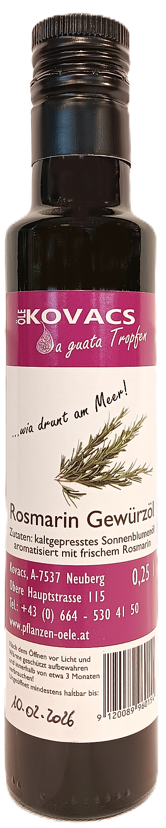 Der Duft von Rosmarin zaubert einen Hauch Süden in die Küche. Dieses Gewürzöl auf der Basis von kaltgepresstem Sonnenblumenöl ist nicht nur eine geschmackliche Bereicherung sondern auch als typisch mediterran gut für die Gesundheit. Zum Erwärmen geeignet!