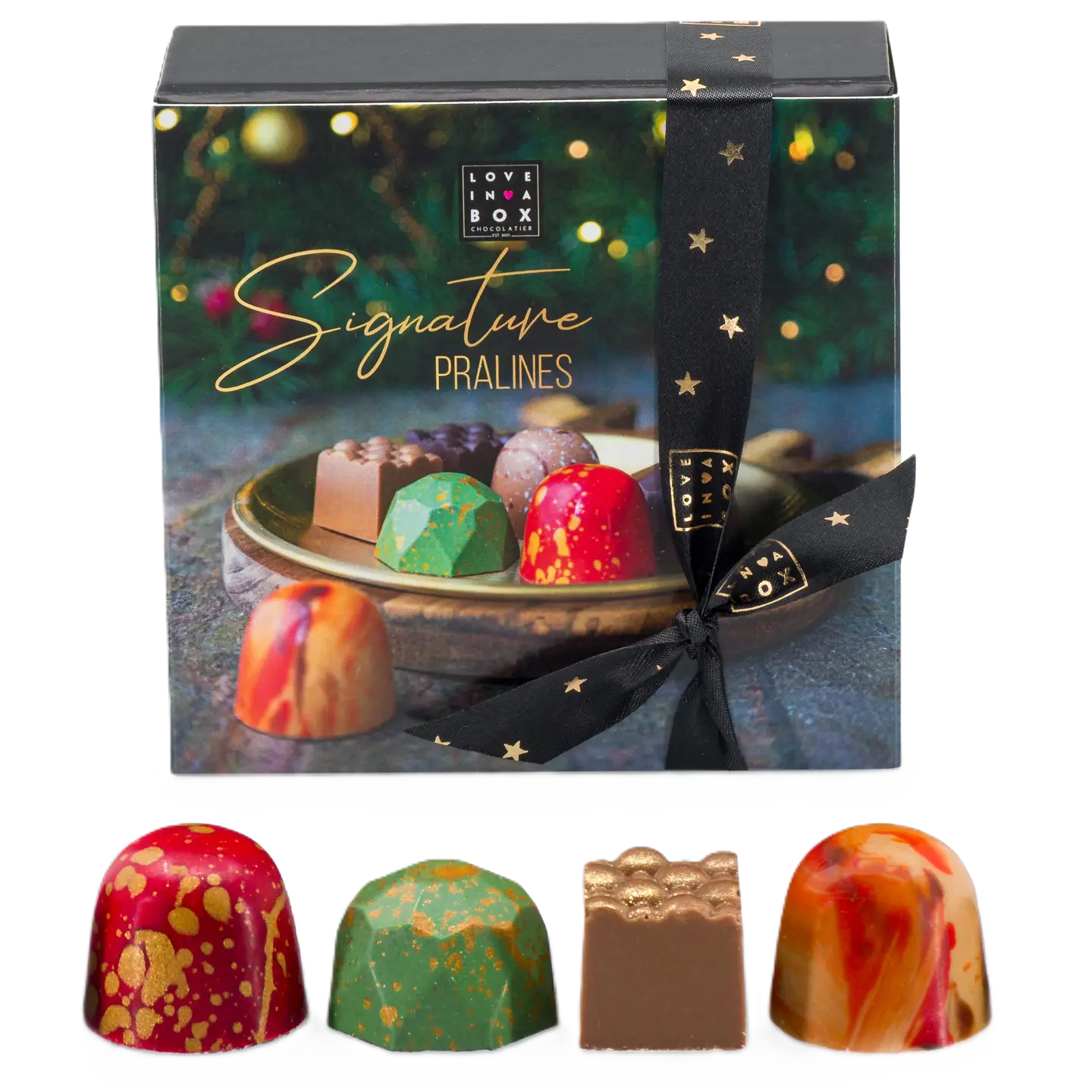 Feiern Sie Weihnachten mit diesen einzigartigen „Signature Pralinen“, den Luxus-Weihnachtsschokoladen. Köstliche und wunderschöne, handgefertigte Luxus-Schokoladepralinen, verpackt in einer luxuriösen Geschenkbox mit Magnetverschluss und einer luxuriösen Hülle.