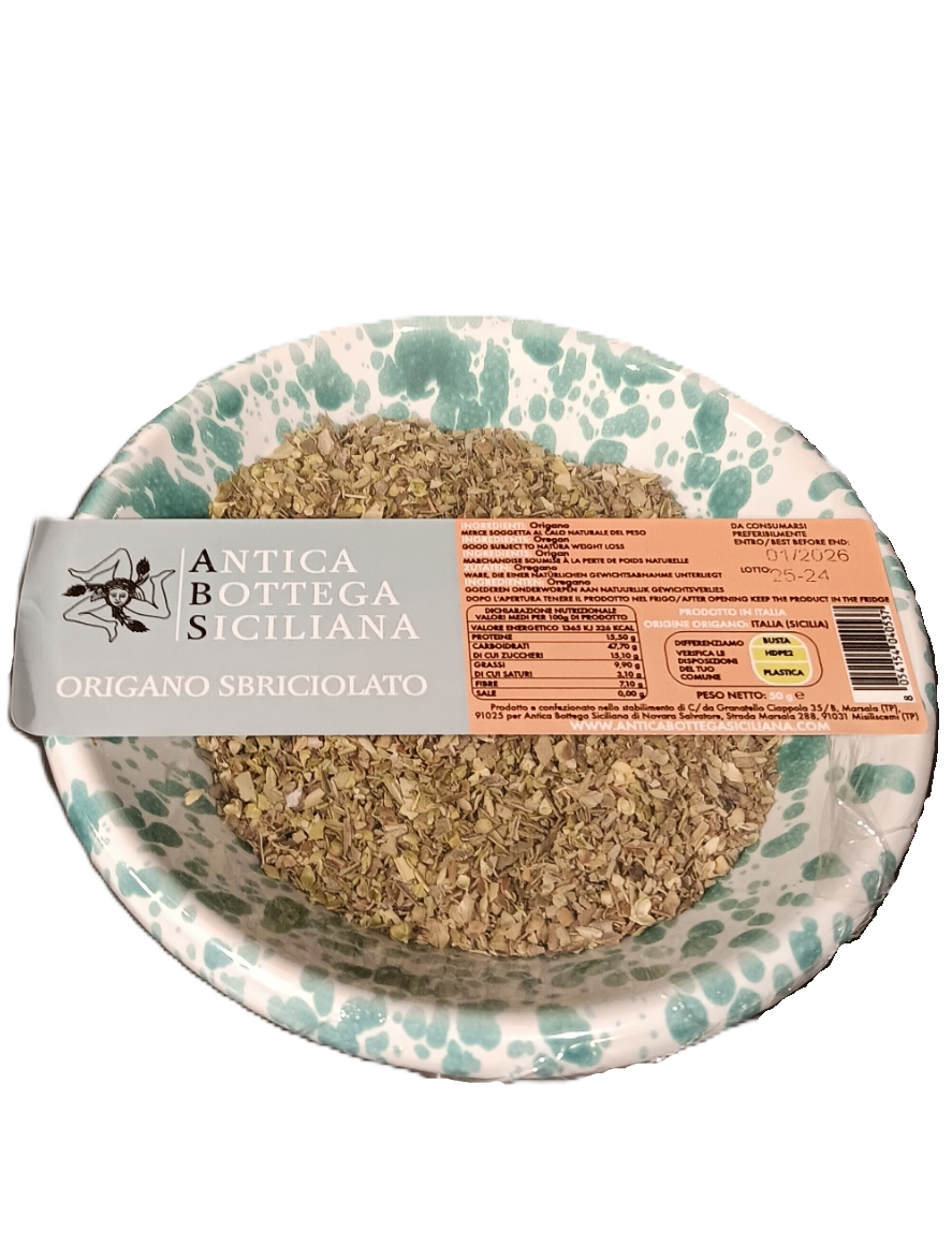 Dieser Berg-Oregano ist handgepflückt, getrocknet, zerkleinert und in einem „Lemmo“ verpackt, einem typisch sizilianischen dekorativen Keramikbecher.