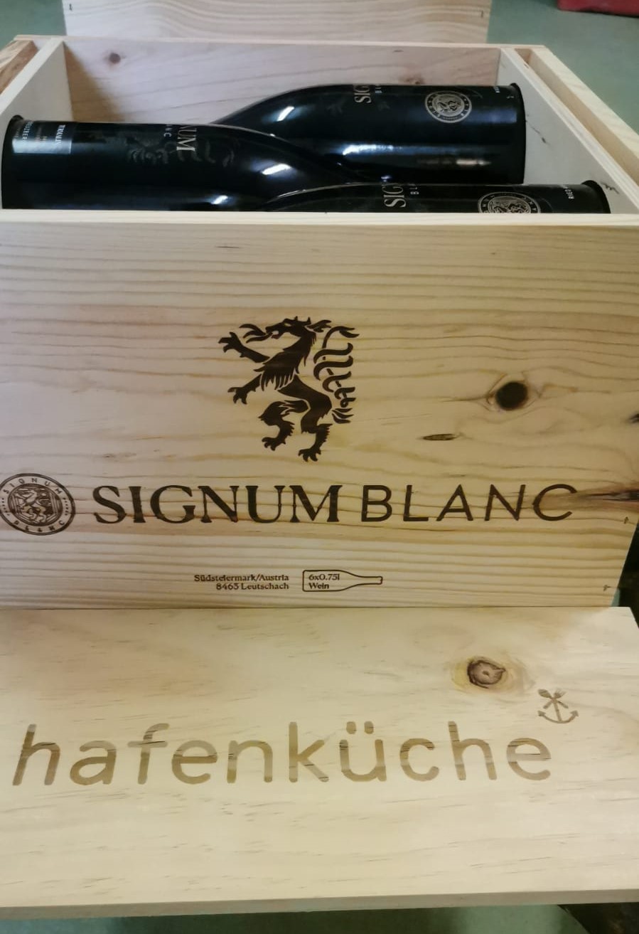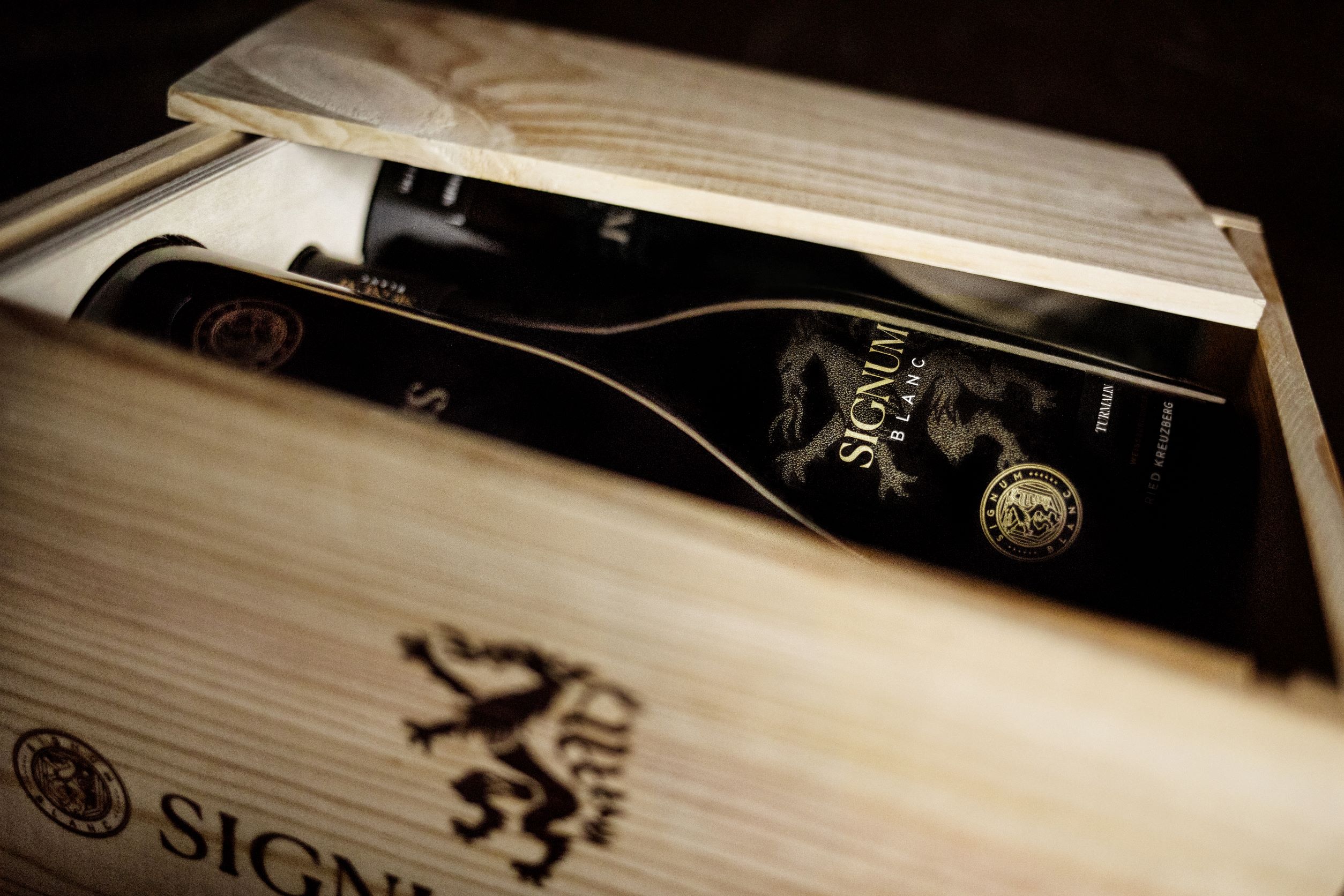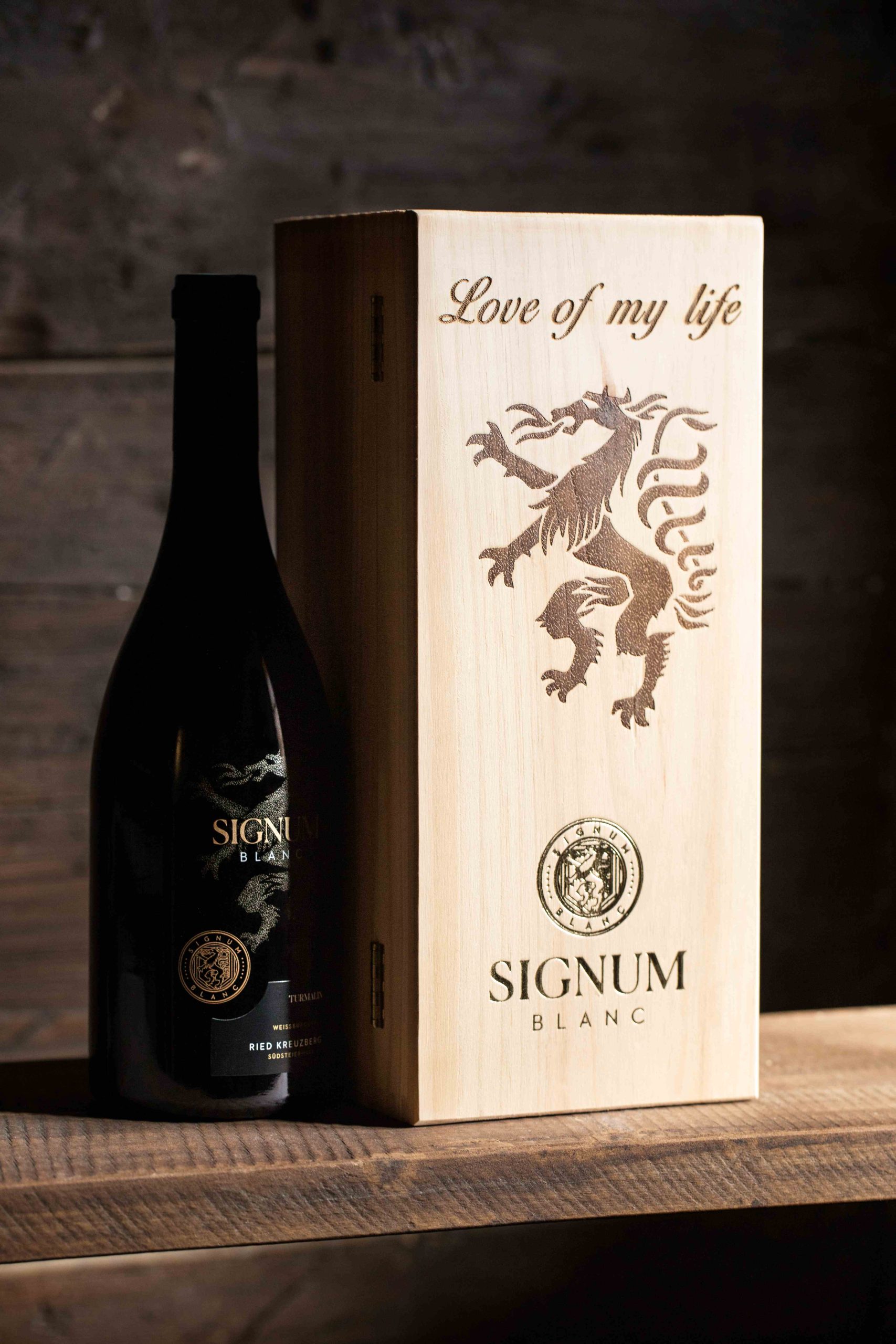 SIGNUM BLANC wird in einer Holzkiste geliefert, die mit einem Namen oder einem kurzen personalisierten Text eingraviert werden kann. Siehe ganz unten in der Weinbeschreibung für weitere Informationen.