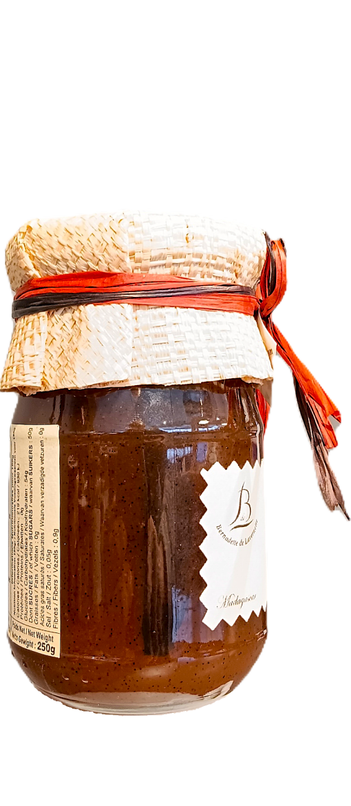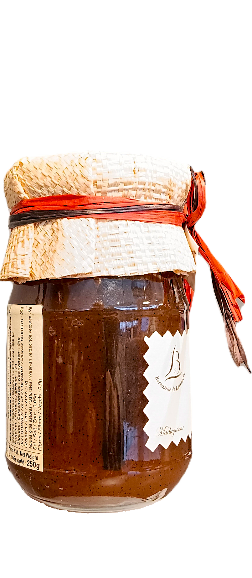 Diese einzigartige Marmelade wird aus den Schoten der saftigen Sava-Vanille im Nordosten Madagaskars hergestellt, die von großen Köchen geschätzt wird. Mit ihrem tiefen und kraftvollen Aroma wird sie schon mit der Nase geschmeckt. Die Vanilleschote ist im Glas deutlich ersichtlich, sehen Sie das Bild von der Seite des Glases.