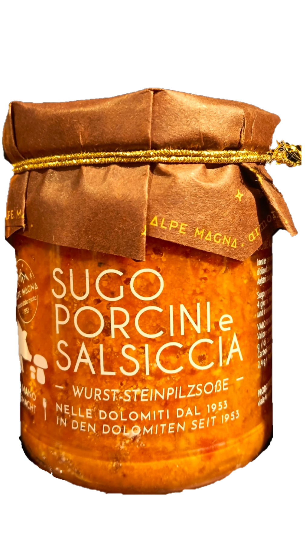 Eine wunderbare Sauce aus italienischen Steinpilzen (Porcini) und Wurst (Salsiccia). Für die Nudeln mit etwas Nudelwasser oder Olivenöl erhitzen. Passt auch perfekt auf Toast oder Bruschetta, oder als Zutat in der Lasagne!